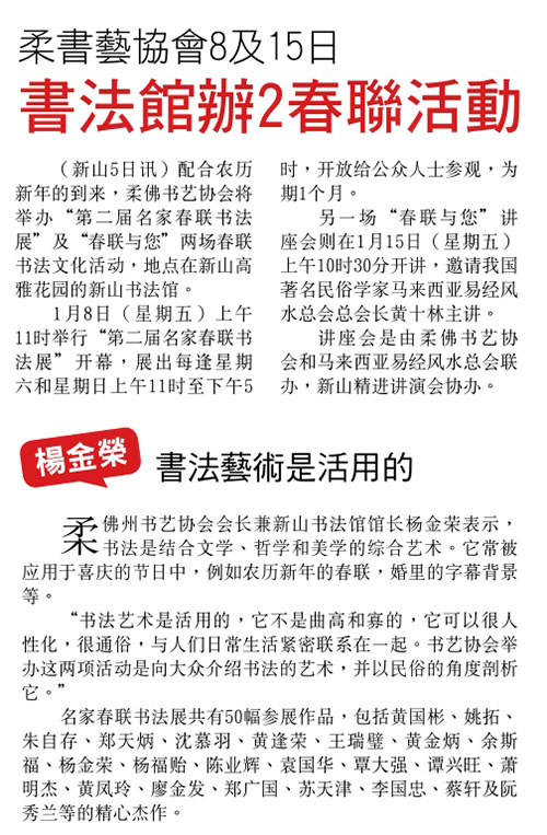 You are here: Home › 活动 › 书法馆办2春联活动 ← 1月9日“春联献培二” 名家春联书法展隆重开幕 → 书法馆办2春联活动 (新山5日讯)配合农历新年的到来,柔佛书艺协会将举办“第二届名家春联书法展”及“春联与您”两场春联书法文化活动,地点在新山高雅花园的新山书法馆。 1月8日(星期五)上午举行“第二届名家春联书法展”开幕,展出每逢星期六和星期日上午11时至下午5时,开放给公众人士参观,为期一个月。 另一场“春联与您”讲座会则在1月15日(星期五)上午10时30分开讲,要求我国著名民俗学家马来西亚易经风水总会会长黄十林主讲。