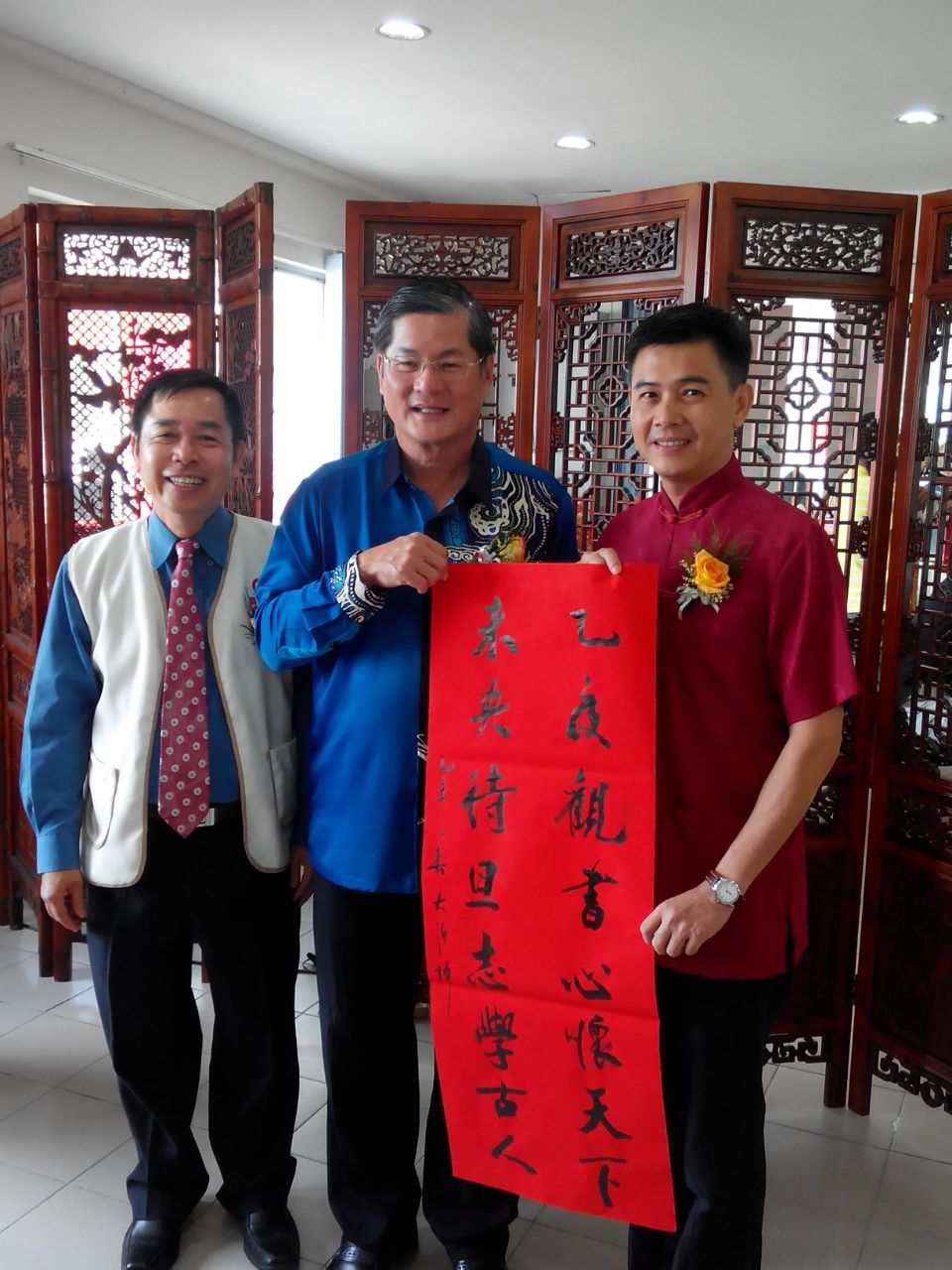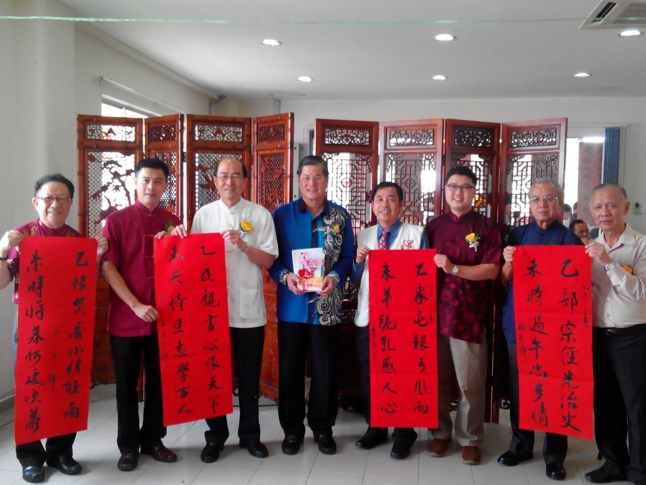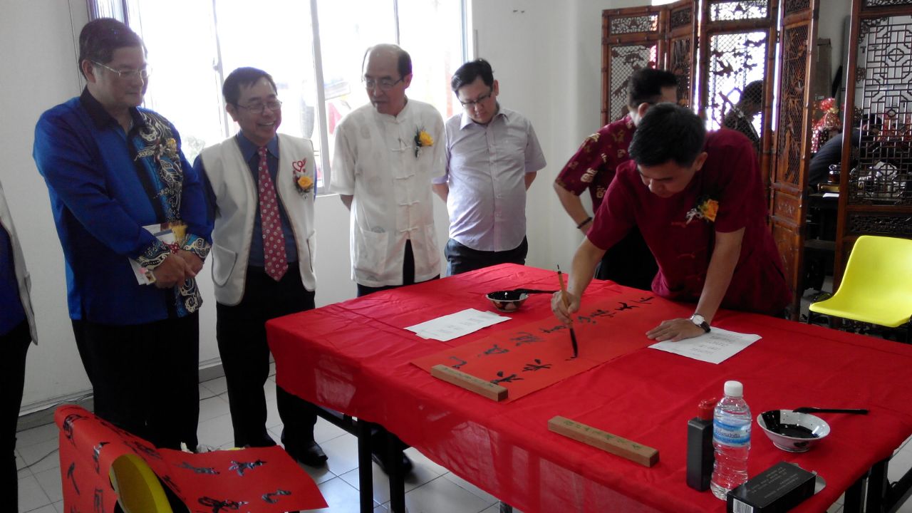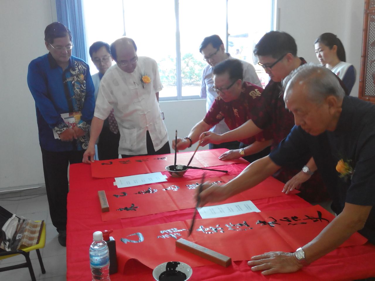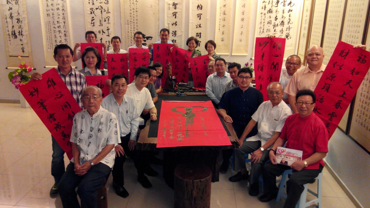 You are here: Home › 活动 › 书法家为喜耀文化学校 义写春联筹款 ← 书法家与书艺之友参观鳄鱼园 新山宽柔五小挥春活动 → 书法家为喜耀文化学校 义写春联筹款 2015年2月7日:上午马来西亚书艺协会新山联委会主席兼新山书法馆馆长杨金荣与柔佛书艺协会会长杨福贻,顾问刘一其,秘书长覃大强为马耒西亚喜耀文化学会设立之”喜耀文化学校”义写春联筹募基金。该活动主宾为新山中华公会会长拿督斯里郑金财、新加坡孔子基金会主席兼东亚人文研究所董事长、新加坡喜耀文化学会会长郭文龙,马来西亚喜耀文化学会会长马英耀,泰丰小学董事长何朝东,亚洲企业杂志总裁徐楗辉等人。