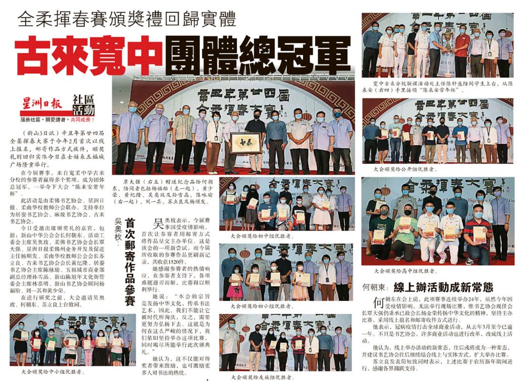 You are here: Home › 挥春比赛 › 全柔会春赛颁奖礼回归实体-古来宽中团体总冠军 ← 全柔会春赛4月3颁奖-优胜者受促准时出席 柔教师线上书法营-40教师聚云端研习 → 全柔会春赛颁奖礼回归实体-古来宽中团体总冠军 星洲日报剪报