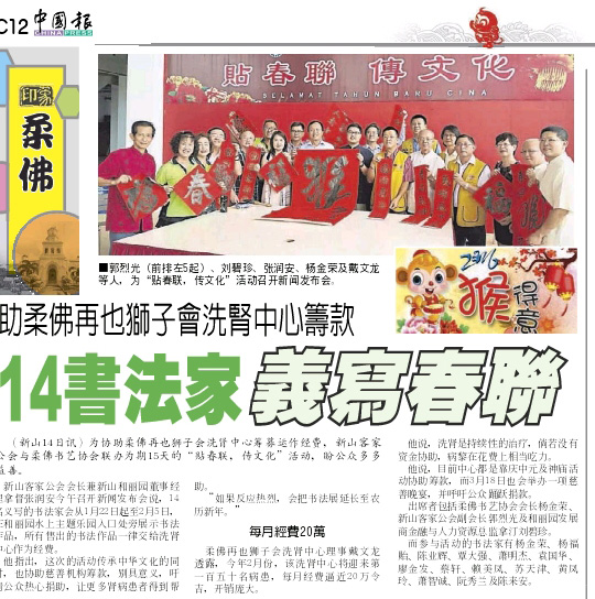 You are here: Home › 活动 › 助柔佛再也狮子会洗肾中心筹款,14书法家义写春联。 ← 与新山客家公会联办,22日起挥春义写。 丙申年”第十九届(2016)挥春大赛”-团体报名 → 助柔佛再也狮子会洗肾中心筹款,14书法家义写春联。 (新山14日讯)为协助柔佛再也狮子会洗肾中心筹募运作经费,新山客家公会与柔佛书艺协会联办为期15天的“贴春联、传文化”,盼公众多多益善。 新山客家公会兼新山和丽园董事经理拿督张润安今午召开新闻发布会说,14名义写的书法家会从1月22日起至2月5日,在和丽园水上主题乐园入口处旁展示书法作品,所有售出的书法作品一律交给洗肾中心作为经费。