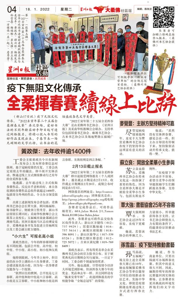 You are here: Home › 活动 › 疫下无阻文化传承-全柔挥春赛续线上比拼 ← 马西玄天上帝古庙百年习俗-游神迎春庆典3花车巡境 壬寅年《第廿五届(2022)全柔挥春大赛》(个人报名表格 *只限柔佛州居民参赛) → 疫下无阻文化传承-全柔挥春赛续线上比拼 星洲日报剪报