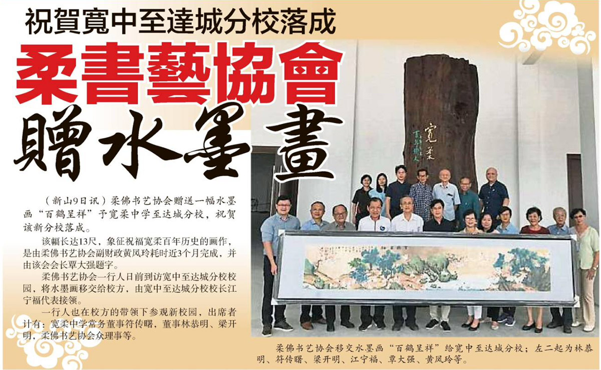 You are here: Home › 活动 › 祝贺宽中至达城分校落成-柔书艺协会赠水墨画 ← 南京篆刻家访新山书法馆-赠横批墨宝书艺交流 辛丑年 第廿四届(2021) 全柔挥春大赛团体报名 → 祝贺宽中至达城分校落成-柔书艺协会赠水墨画 星洲日报剪报
