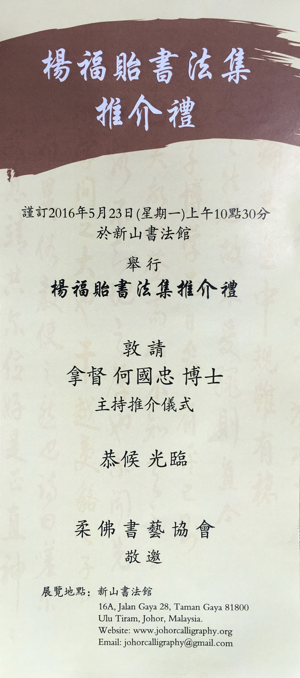 You are here: Home › 活动 › 邀請出席《楊福貽書法集》推介禮 ← 杨福贻书法展及《楊福貽書法集》推介禮报道 邀請出席楊福貽書法展 → 邀請出席《楊福貽書法集》推介禮 柔佛书艺协会在新山書法館推介《楊福貽書法集》,邀請我國策略分析與政策研究所主席拿督何國忠親臨主持推介禮。 展览日期:2016年5月23日(星期一) 展览时间:上午10点30分 展览地点:新山书法馆 16A, Jalan Gaya 28, Taman Gaya 81800, Ulu Tiram, Johor, Malaysia.